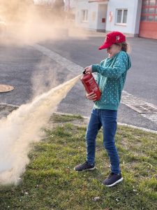 Nach der Theorie ging es in die Praxis: Die Kinder durften unter Anleitung selbst Hand anlegen und den Umgang mit verschiedenen Feuerlöschern ausprobieren. Mit großer Begeisterung testeten sie die richtige Handhabung und konnten einige Löschmittel selbst ausprobieren.